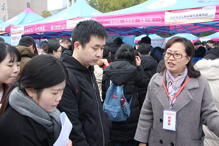 当日,共有来自北京、上海、江苏、浙江、安徽、广东、湖北、山东、新疆等18个省、市、自治区486家用人单位实现线上线下同步招聘,提供就业岗位近20000个。各用人单位现场摆放出招聘信息,招贤纳士,各招聘展位、服务咨询台前都围满了前来求职的学生。本次毕业生就业市场呈现出“一精准四多”特点:一是学校毕业生就业指导中心通过建立网上就业创业服务云平台,把学生的需求和用人单位的需求进行智能匹配,在网上实时、精准对接,方便毕业生通过平台订阅最新就业信息,网上投递简历,顺利实现就业。二是参会用人单位达到历史新高,比去年同期增长55%;三是组团招聘多,本次就业市场招聘单位近85%为省内外基层医疗单位,其中江苏省卫生人才交流服务中心、上海市青浦区卫生和计划生育委员会、青岛市卫生和计划生育人才综合服务中心、深圳市宝安区卫生和计划生育局、海门市卫生和计划生育委员会、盐城市大丰区卫生和计划生育委员会、安徽省宿松县卫生和计划生育委员会、衢州市卫生健康委员会等29个卫计委带队参加招聘。四是现场签约多,2日下午,学校共举办了近60场专场招聘会考试,宿松县卫计委、桐城市人民医院、海门市人民医院等省内多家医院联合当地人社部门、卫计委等多家部门来校组织学生考试、面试,对录取的学生现场签约,大大的提升了签约效率,节约就业成本。