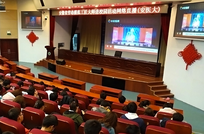 4月3日下午,由安徽省委宣传部、省委教育工委、省总工会等部门联合主办的“安徽省劳动模范工匠大师进校园”活动在安徽职业技术学院礼堂举行。我校组织学生通过网络视频同步收看报告会。学工部在校图书馆第一学术报告厅设立主会场,南校区及各学院设立分会场。