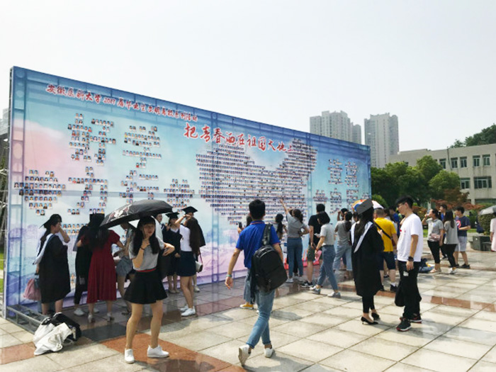 毕业典礼当天,学校为每位本科毕业生发放文化衫,在文化广场竖起了巨幅毕业照片墙,寄语毕业生把青春洒在祖国大地上,在追梦的道路上坚定理想信念、练就过硬本领、勇于创新创造、矢志艰苦奋斗、锤炼高尚品格,成为有理想、有本领、有担当的新时代青年。