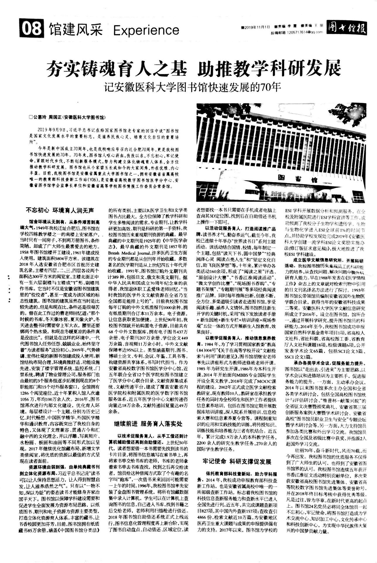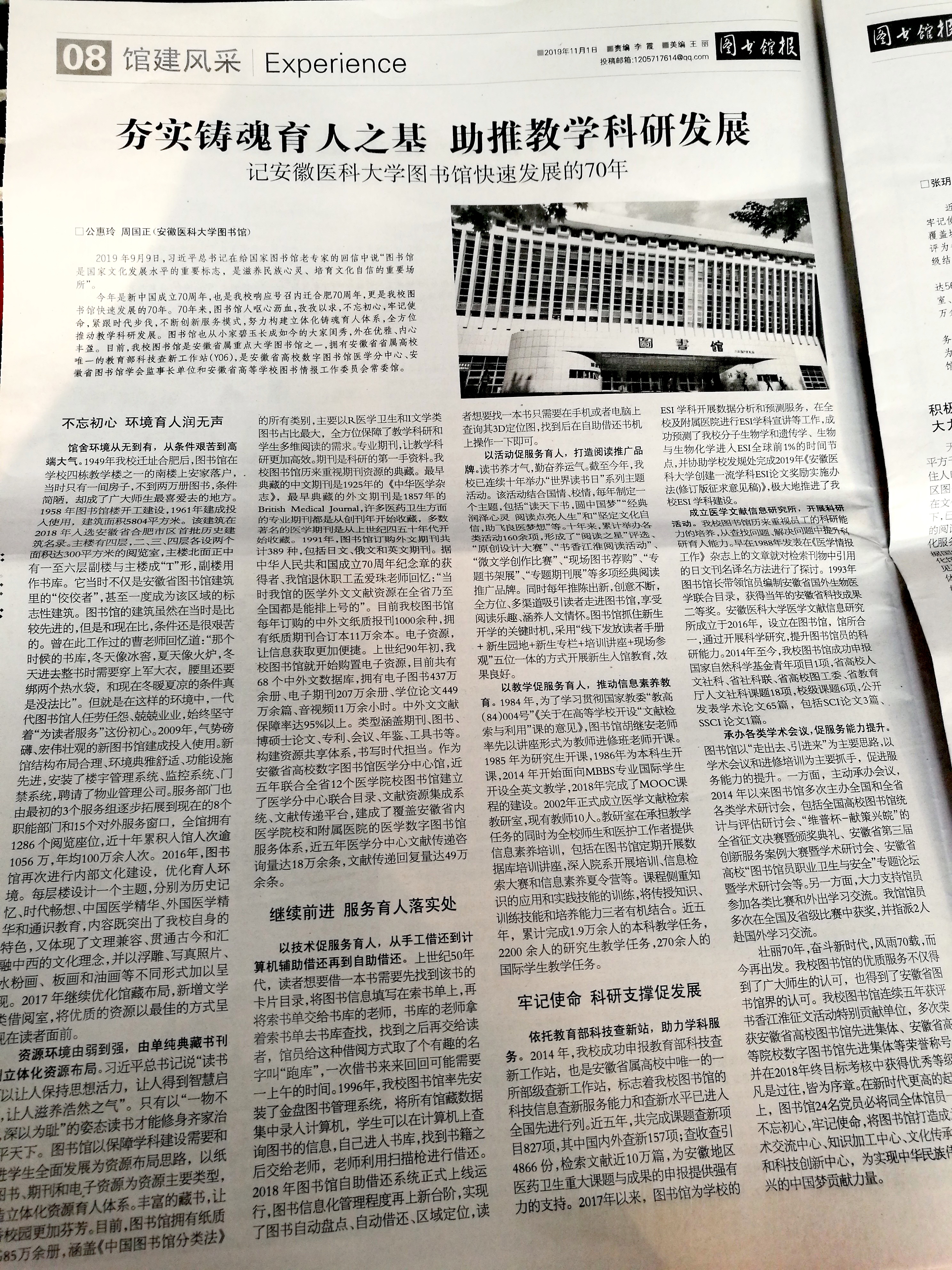 今年是新中国成立70周年,也是我校响应号召内迁合肥70周年,更是我校图书馆快速发展的70。70年来,图书馆人呕心沥血,孜孜以求,不忘初心,牢记使命,紧跟时代步伐,不断创新服务模式,努力构建立体化铸魂育人体系,全方位推动教学科研发展。图书馆也从小家碧玉长成如今的大家闺秀,外在优雅、内心丰盈。目前,我校图书馆是安徽省属重点大学图书馆之一、拥有安徽省省属高校唯一的教育部科技查新工作站(Y06)、是安徽省高校数字图书馆医学分中心、安徽省图书馆学会监事长单位和安徽省高等学校图书情报工作委员会常委馆。