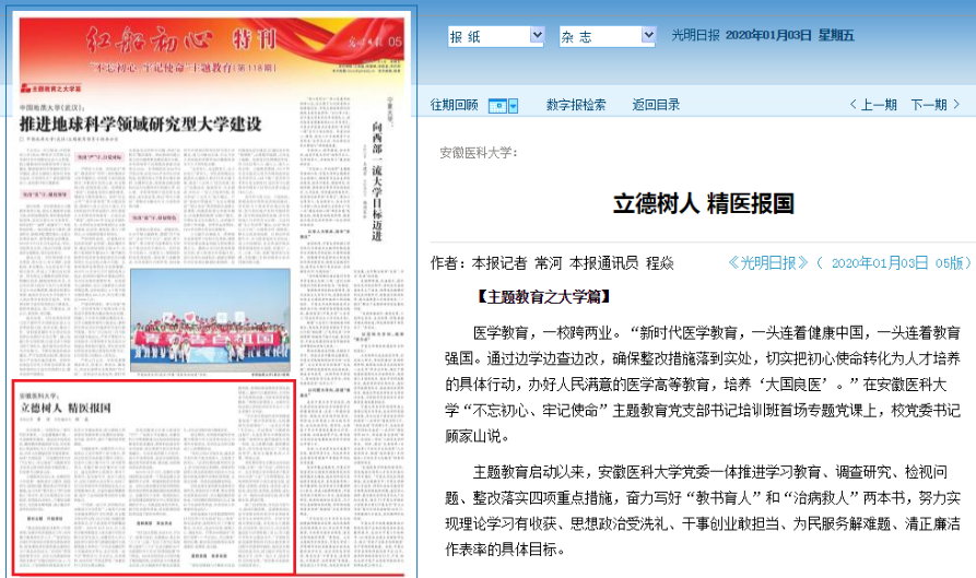 学校党委注重发挥先进典型引领作用,在组织学习李夏、黄文秀等先进典型的同时,举办模范教师报告会,刊印《精医报国铸初心》,汇编60个先进典型事迹,用身边的人和事教育身边的人。