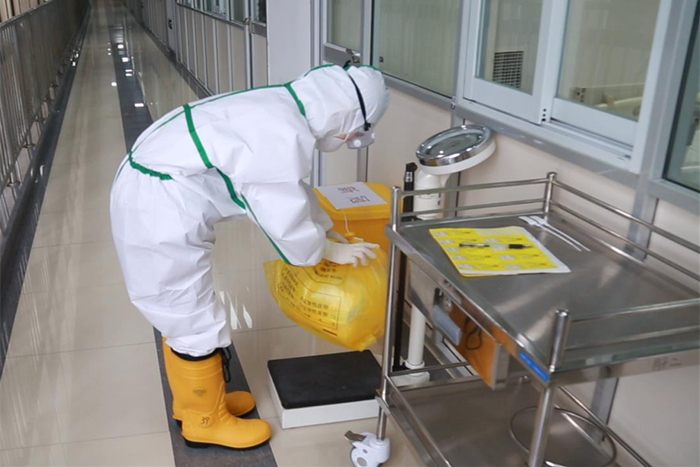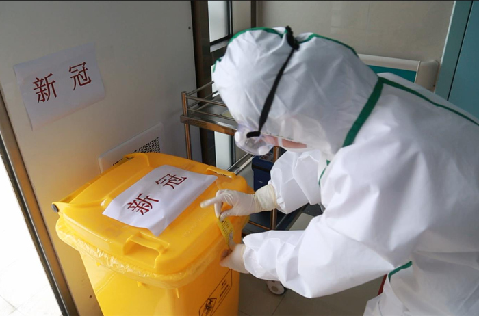 据了解,该院新冠病房内与患者有接触的所有垃圾都被视为“新冠医疗废物,除隔离服、口罩等医用防护品外,饭盒、纸巾、筷子甚至报纸等都由专业人员密封处置并在24小时内迅速转运。标有“新冠”字样的醒目黄色垃圾袋、垃圾桶专门用于装袋和转运。为防止交叉感染的发生,医院专门处理“新冠医废的人员身穿防护服对垃圾袋采用鹅颈结式特殊手段进行包扎密封,经称重记录、消毒喷洒、扫码确认等多重环节处理后,从专用通道运送至医院的垃圾固体废物暂存处置中心。暂存处置中心为普通固废和“新冠医废开辟双门分开清运,即一个用来运送普通医疗废物,一个专门用来运送新冠医疗废弃物。