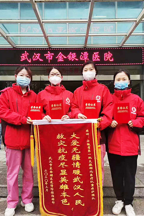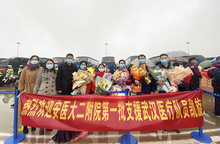 本次返回的首批医疗队包含我校第一附属医院5人,第二附属医院5人,第四附属医院4人,附属巢湖医院4人以及附属阜阳医院4人。他们全部经过重症监护专科培训,具有丰富的临床和管理经验,是一支业务精湛、素质过硬的队伍。随着新冠肺炎疫情得到控制,在其他医疗队员陆续撤离、载誉而归的时候,首批出征的他们毅然坚守在武汉抗疫一线,成为了抗疫火线上的中流砥柱、最美“逆行者”的标兵。自1月27日奉命出征,他们至今已在武汉战“疫”一线整整奋战了64个日夜。