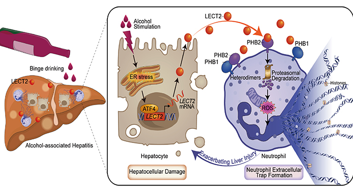 机制研究表明,酒精刺激肝细胞出现内质网应激,LECT2作为肝细胞发出的“信使”能够特异性结合中性粒细胞膜受体PHB2,破坏PHB1/PHB2异源二聚体的稳定结构,通过抑制线粒体自噬导致中性粒细胞内活性氧蓄积,进而触发中性粒细胞胞外诱捕网(NETs)的过度生成并加剧肝损伤。该研究揭示了AH进程中“肝细胞-中性粒细胞对话”的分子机制,不仅为解析AH发病机制提供了新视角,更重要的是确立了LECT2-NETs信号轴作为潜在AH治疗靶点的科学依据。